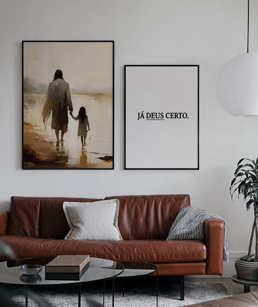 Repare no tamanho dos quadros em relação ao sofá de 2,5 m de largura (imagem abaixo) e à mulher de 1,65 m de altura (imagem abaixo). Isso também vai te dar uma boa noção na hora de fazer a sua escolha. Para outros tamanhos, consulte via WhatsApp.