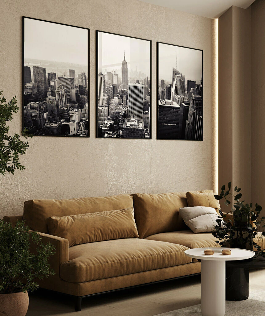 Repare no tamanho dos quadros em relação ao sofá de 2,5 m de largura (imagem abaixo) e à mulher de 1,65 m de altura (imagem abaixo). Isso também vai te dar uma boa noção na hora de fazer a sua escolha. Para outros tamanhos, consulte via WhatsApp.